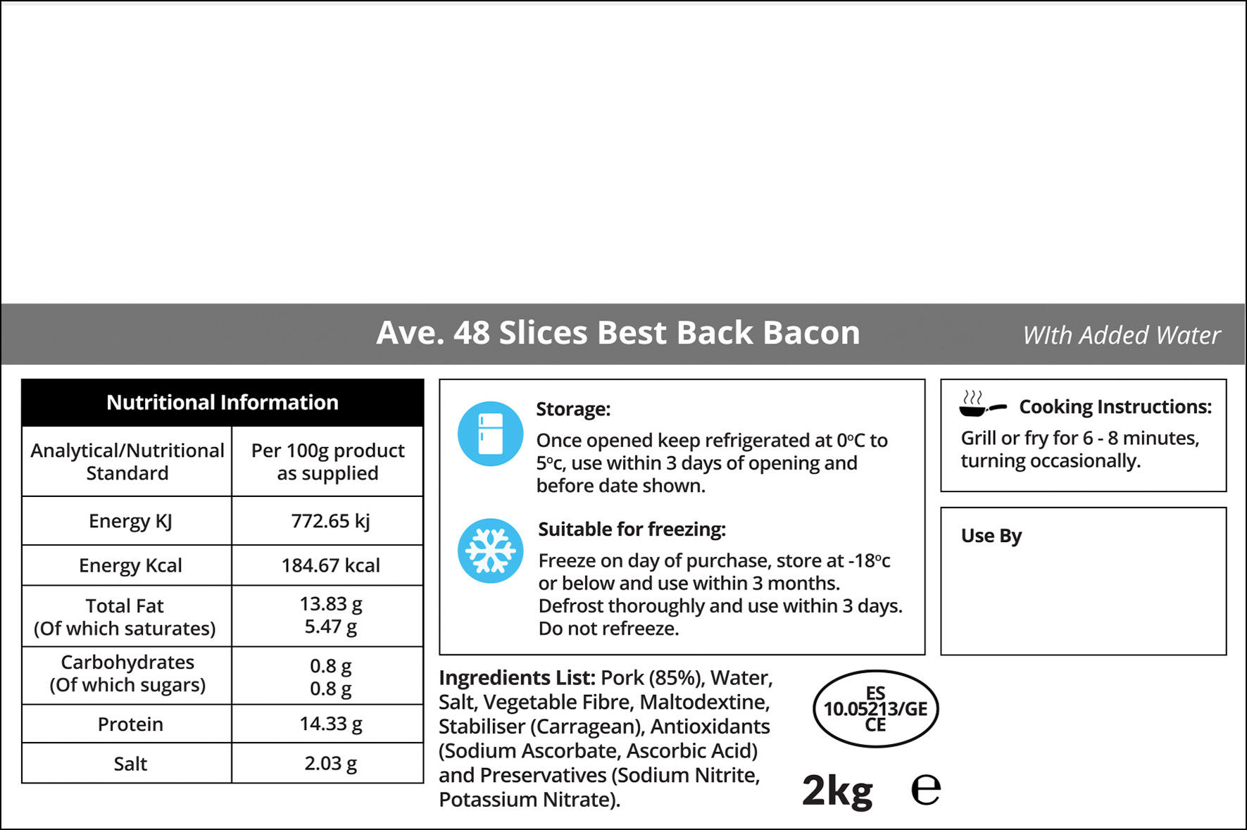| Product Life | A) from day of slaughter to curing: 5 days maximum B) curing time minimum: 3 days C) maximum time from cure to packing/slicing is: 10 days D) from day of packing/slicing to consumption: 56 days bulk (chilled) 365 days (frozen) Chilled - all products must be coded with use by date and batch code Frozen - all products must be coded with frozen on and best before date, plus batch code |